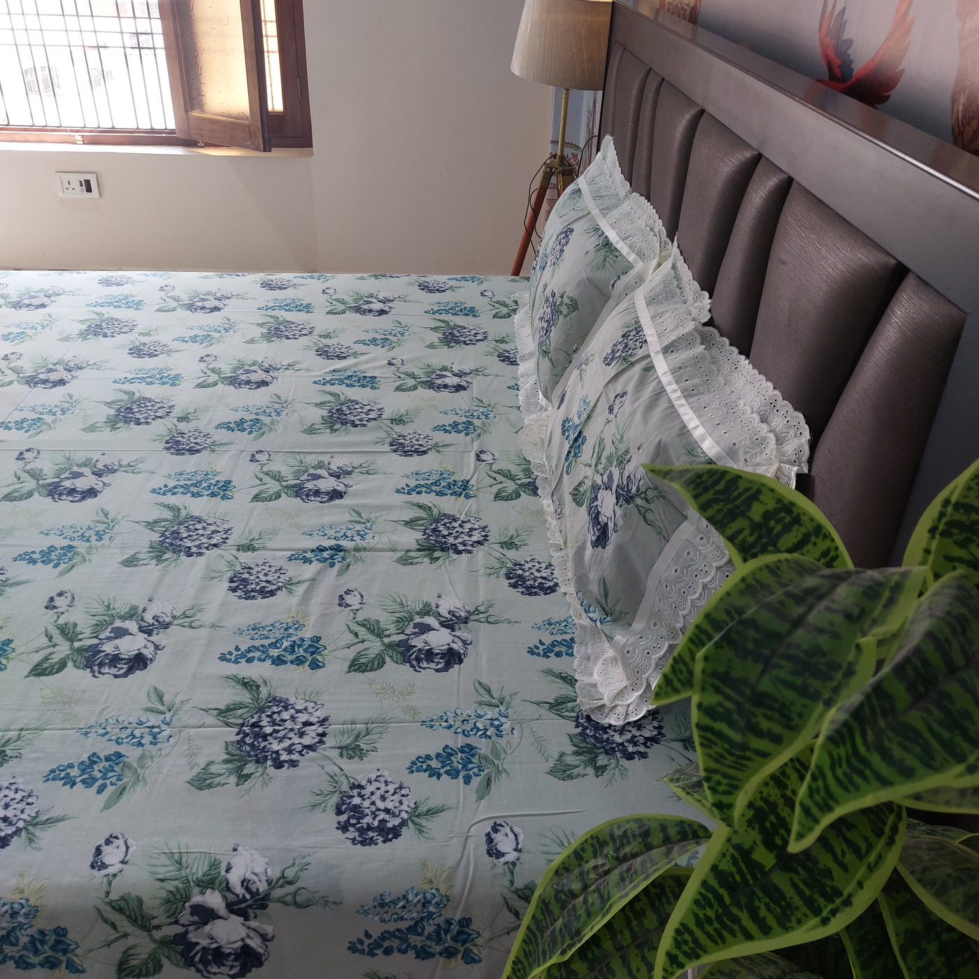 Discover the sage green bedsheet with blue floral bouquet design made from pure cotton for a cool, breathable sleep experience. Its elegant, nature-inspired design and lace detailed pillow covers adds a sophisticated touch to your bedroom.